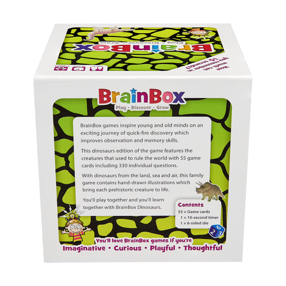 BrainBox is a fun memory and observation card game which tests your eye for detail. What can you remember in just 10 seconds? This dinosaurs edition of the game features creatures from all three prehistoric era’s; Triassic, Jurassic and Cretaceous.