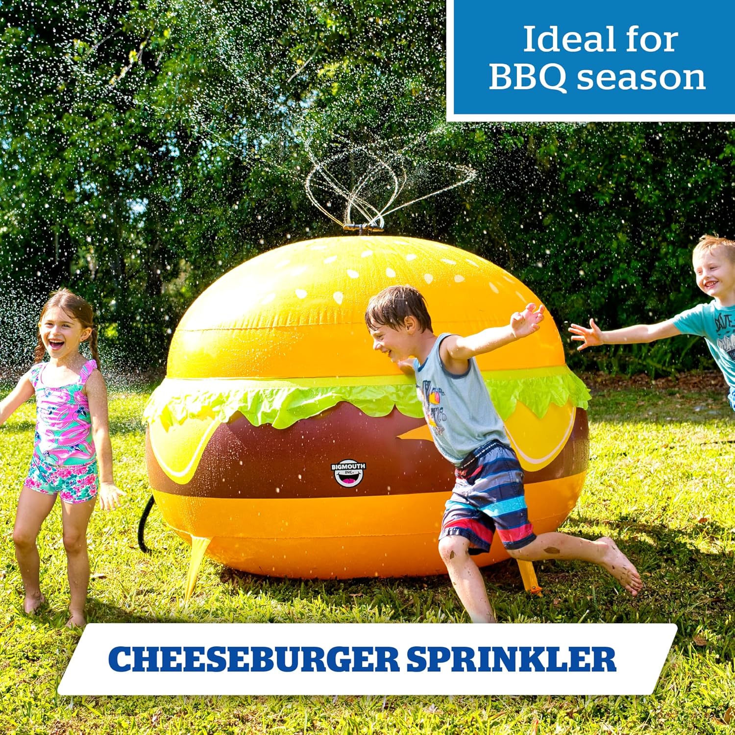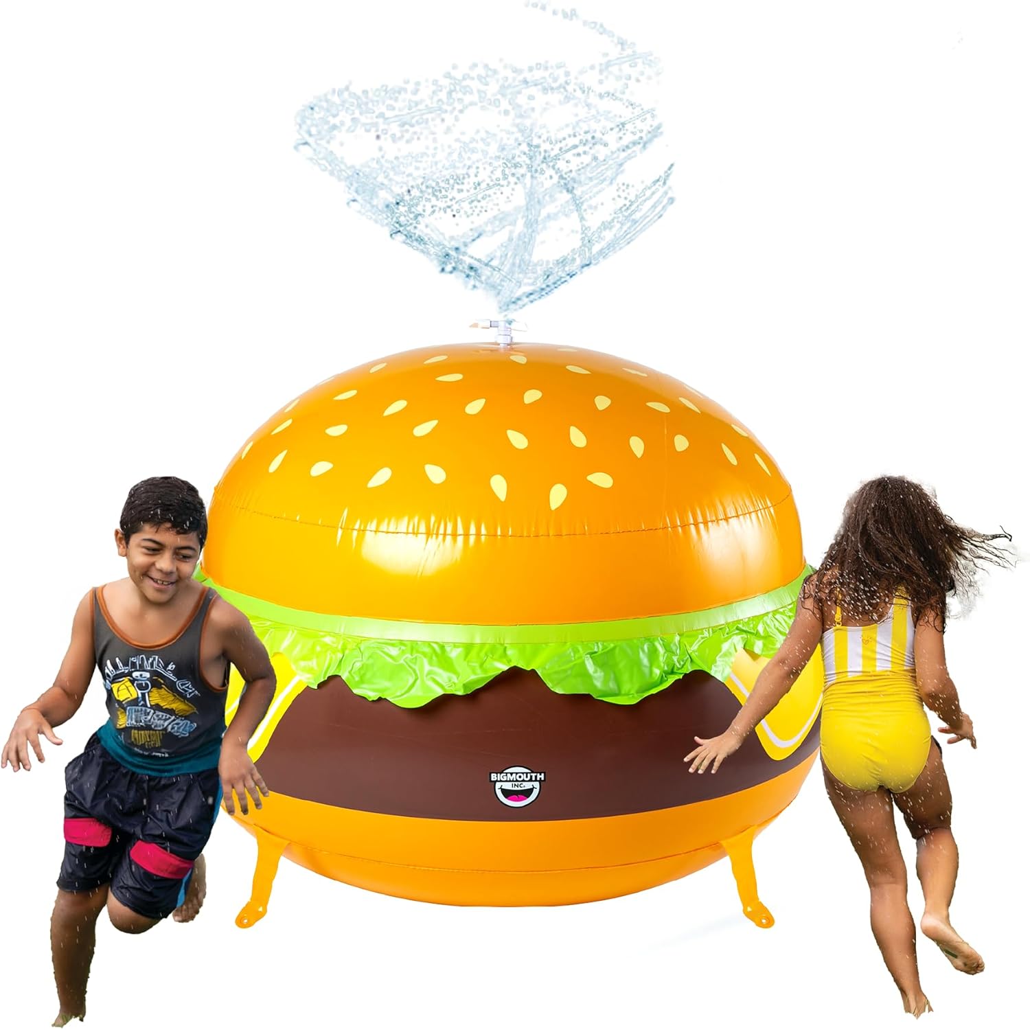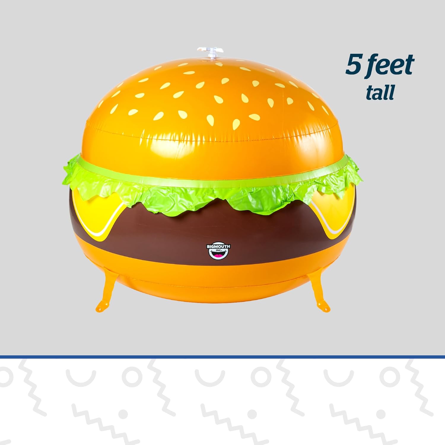 Bigmouth cheese burger sprinkler perfect to beat the summer heat. Super-sized and super-awesome, this inflatable sprinkler is equipped with a spinning top sprinkler that soaks in a 360 degree pattern. Great for barbeques, backyard fun, decoration and more.