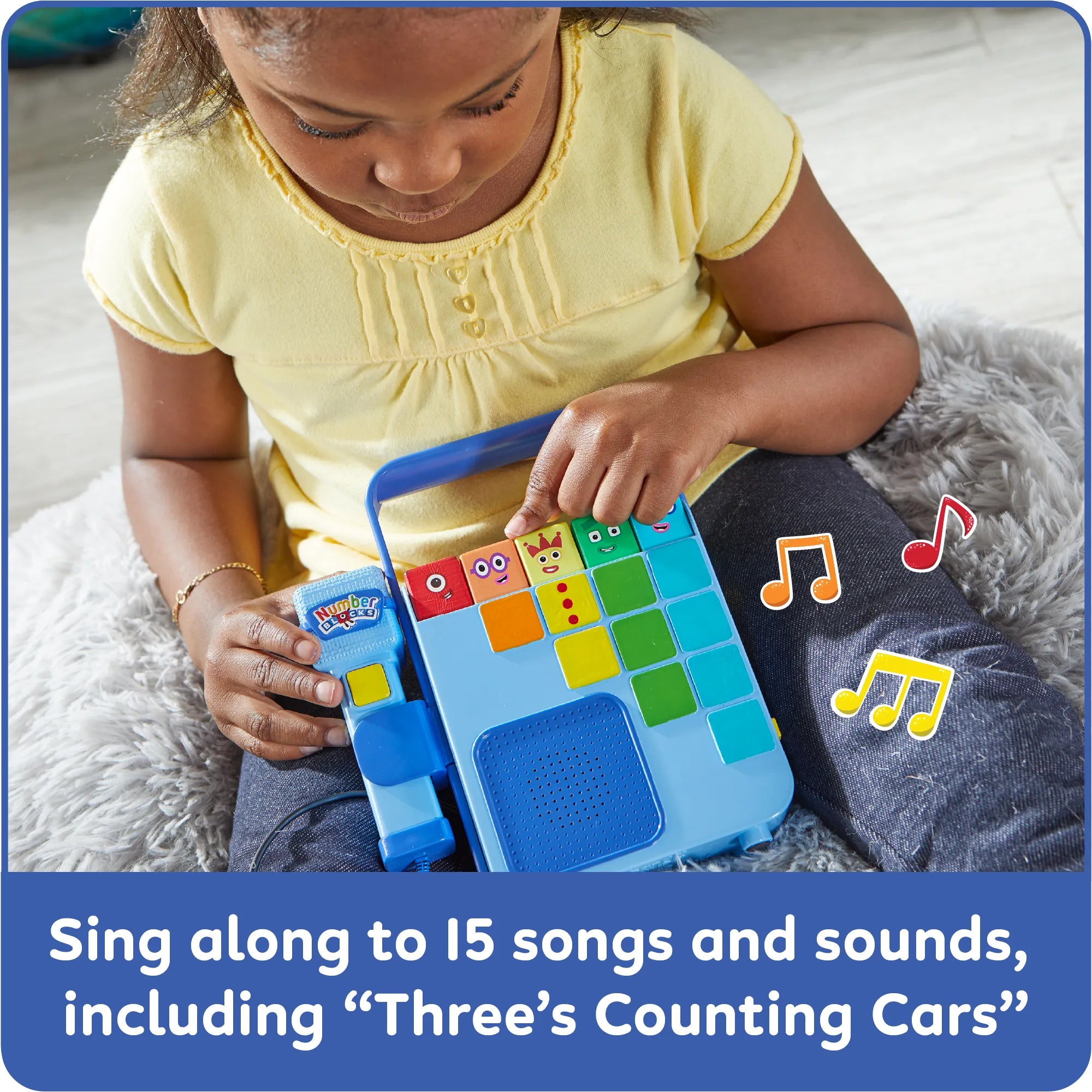 Sing and count along with your favorite Numberblocks! Put on a musical, math-tastic show with your favorite Numberblocks™ friends using the Numberblocks Sing and Record Music Player! Features 15 lively Numberblocks sounds and songs, including the Numberblocks theme song. Children can simply press the buttons to count and enjoy a musical mix of numbery songs and phrases. Adjust the volume to entertain a crowd, or use the headphone jack for a private concert. The player is portable with an attached microphone and easy-carry handle—take the show wherever you go! They will delight in imaginative play as they amplify and record their voices with the built-in microphone—and use the playback feature to enjoy the math melodies they create. Record and replay up to 90 seconds of audio. Includes 1 Music Player with Attached Microphone and 2 AA Batteries.