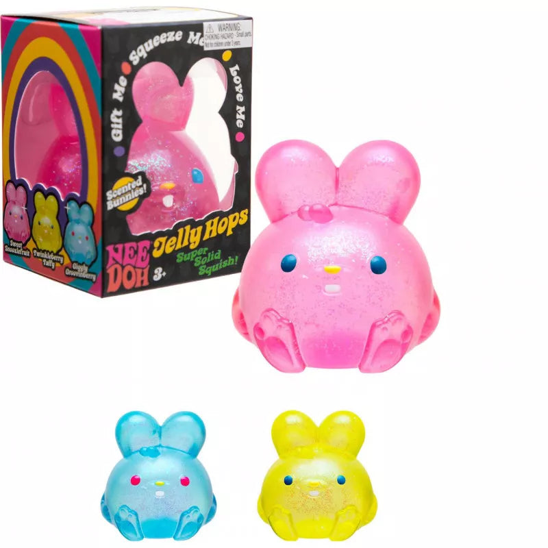 Happy hoppy bunnies with sweet jellybean scents for squish 'n sniff sensory satisfaction! These bunnies are bursting with sweet smells of strawberry, banana and blue raspberry! Sparkly solid squish.