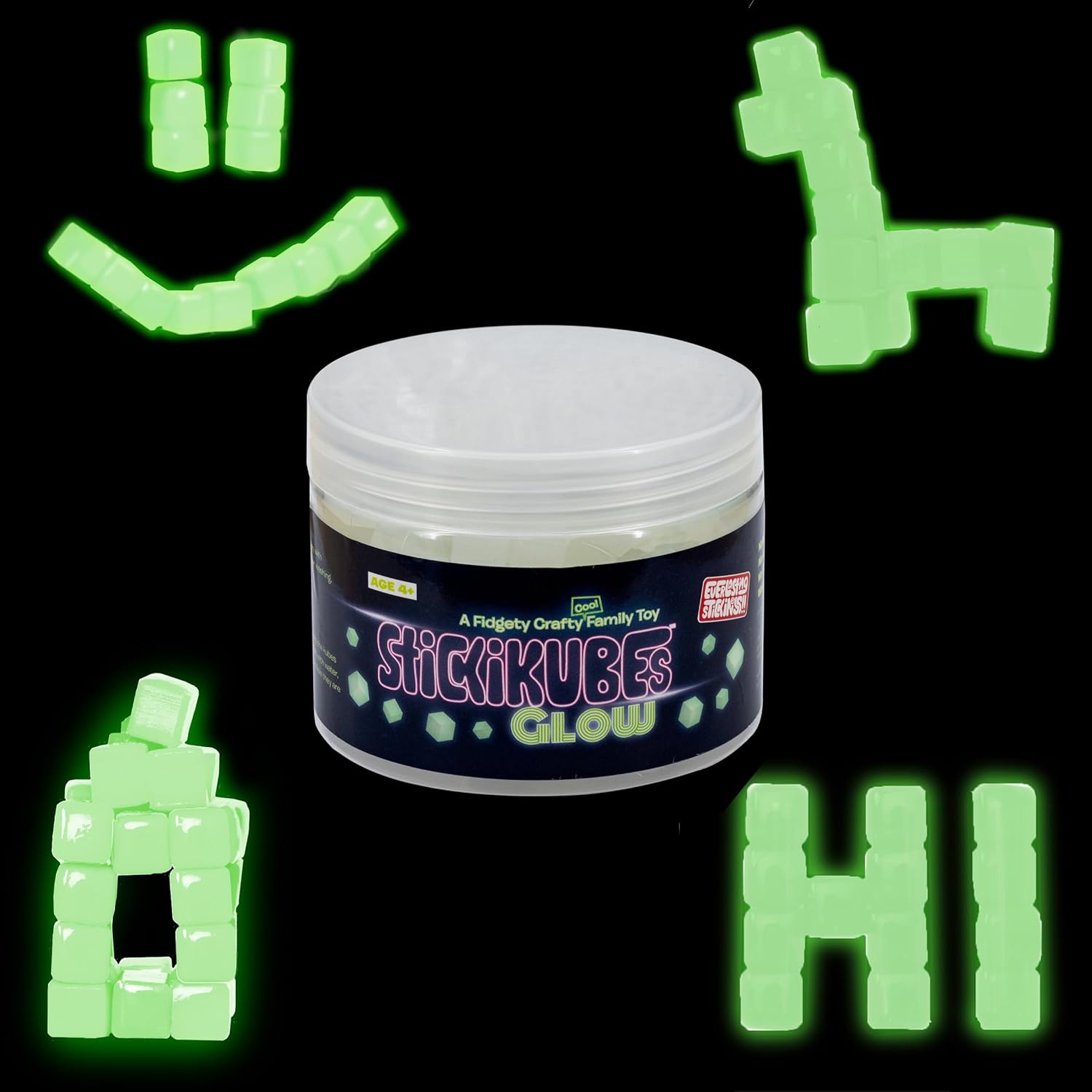 STICKY CREATIONS – NOW GLOWING! StickiKubes are the endlessly fun mini stacking cubes that stick to almost anything—except fabric. Kids can build glow in the dark 2D mosaics, 3D sculptures, or decorate surfaces all around the house, classroom, or office. When the lights go out, the creativity lights up!